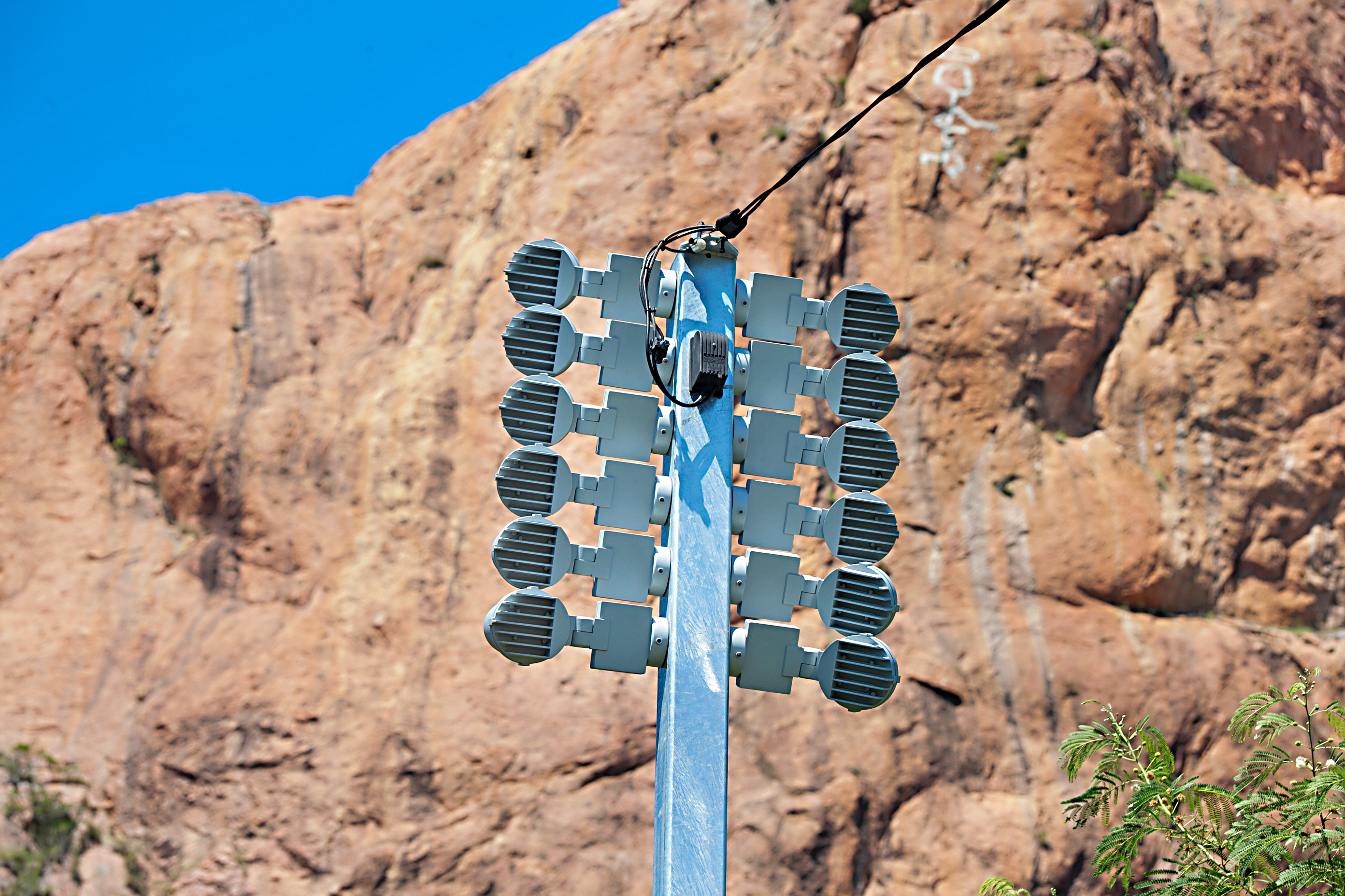 To match this challenge Raylinc supplied (12 x) We-ef FLC141 36W LED narrow beam 3000K projectors fitted with glare shields. The LED projectors were stacked vertically in two rows of six on either side of a SHS column thus reducing the visual impact to the area. The new installation enhanced the colour rendition of the rock face, something that was previously not observed.