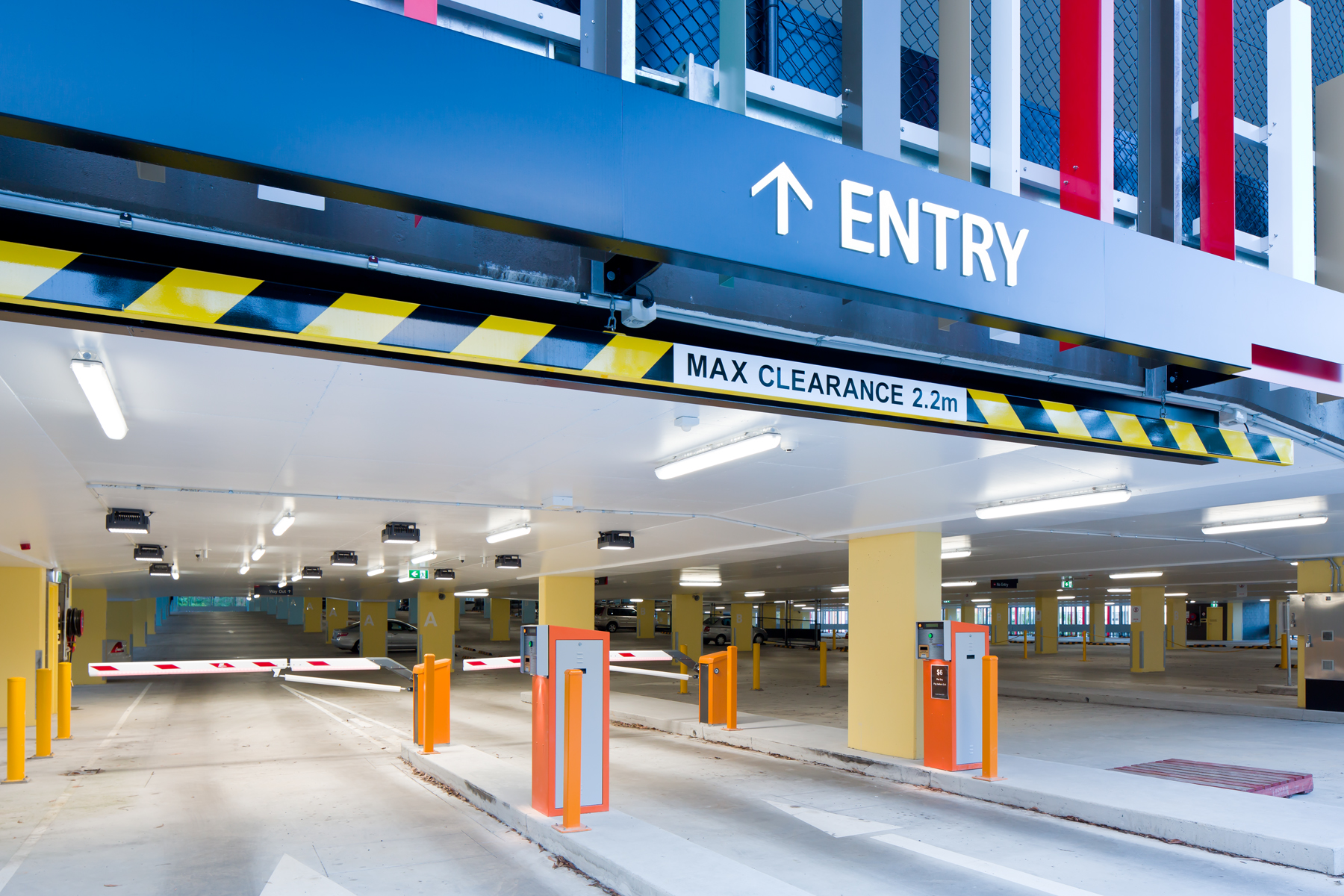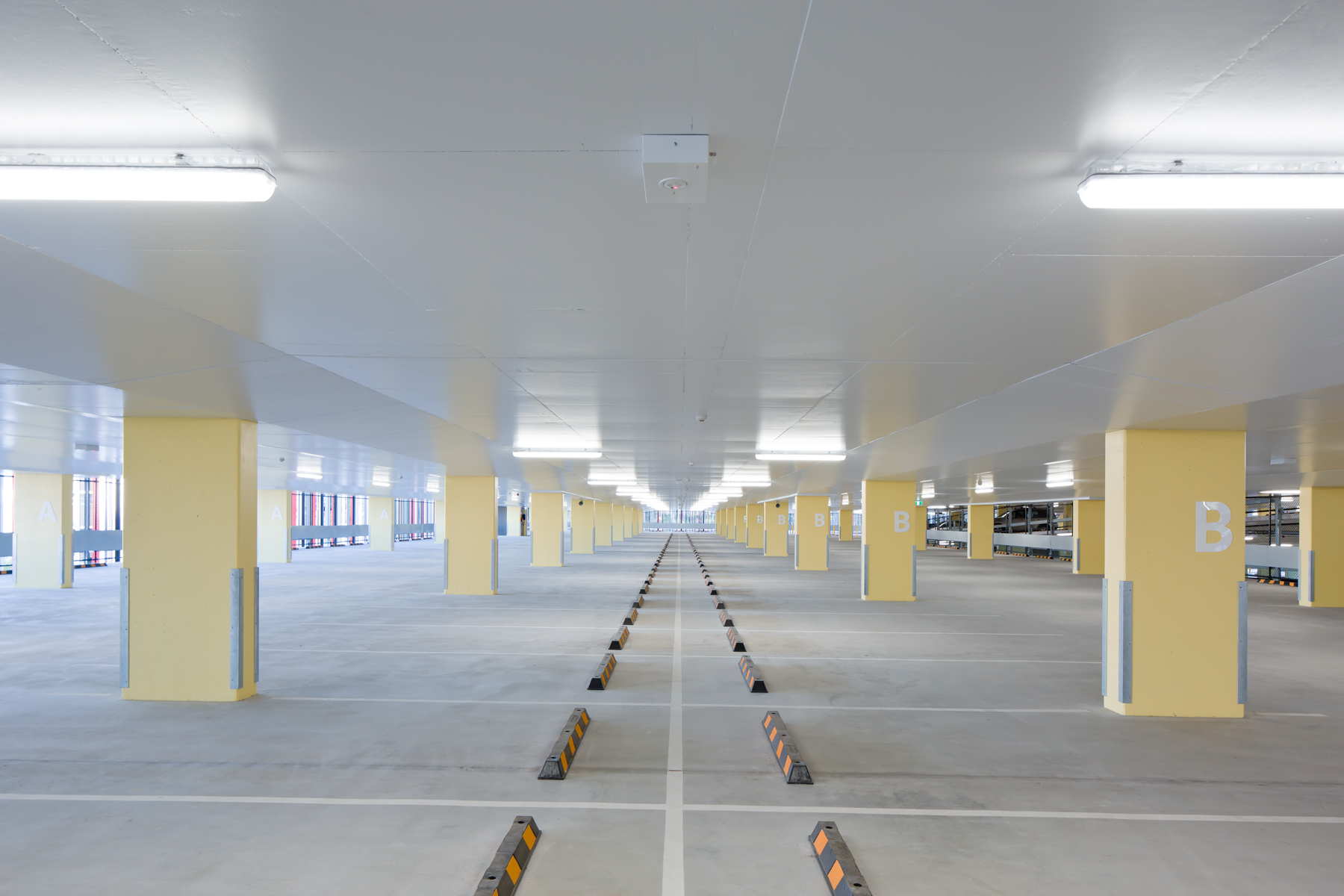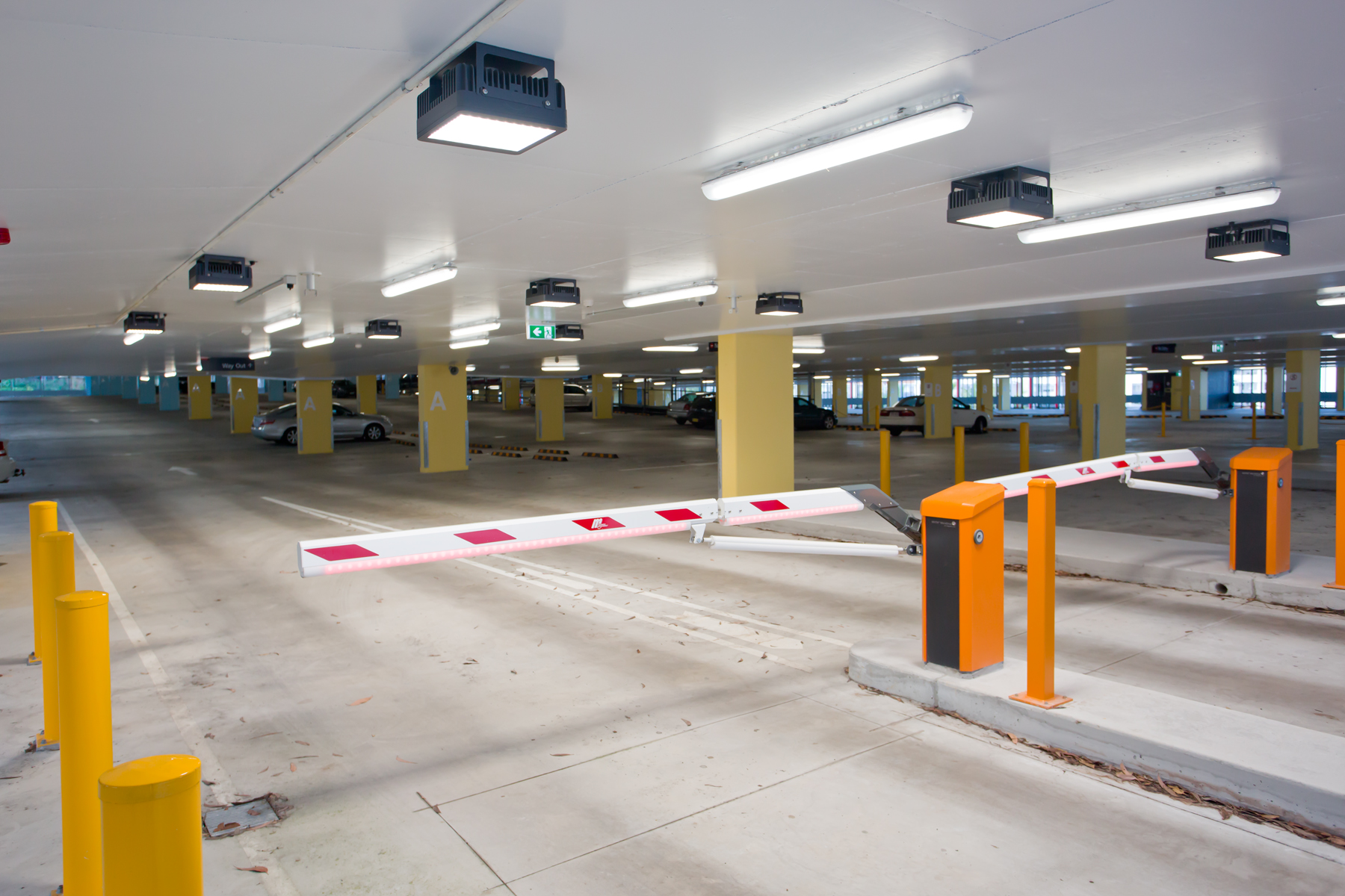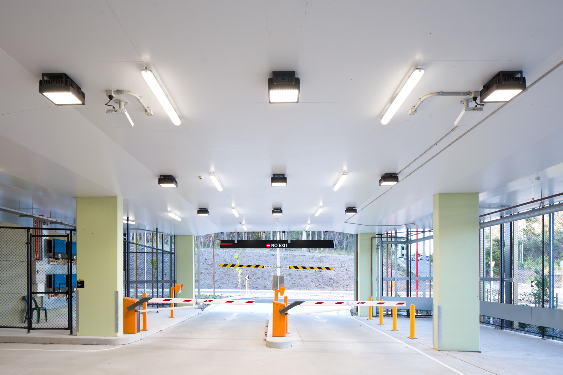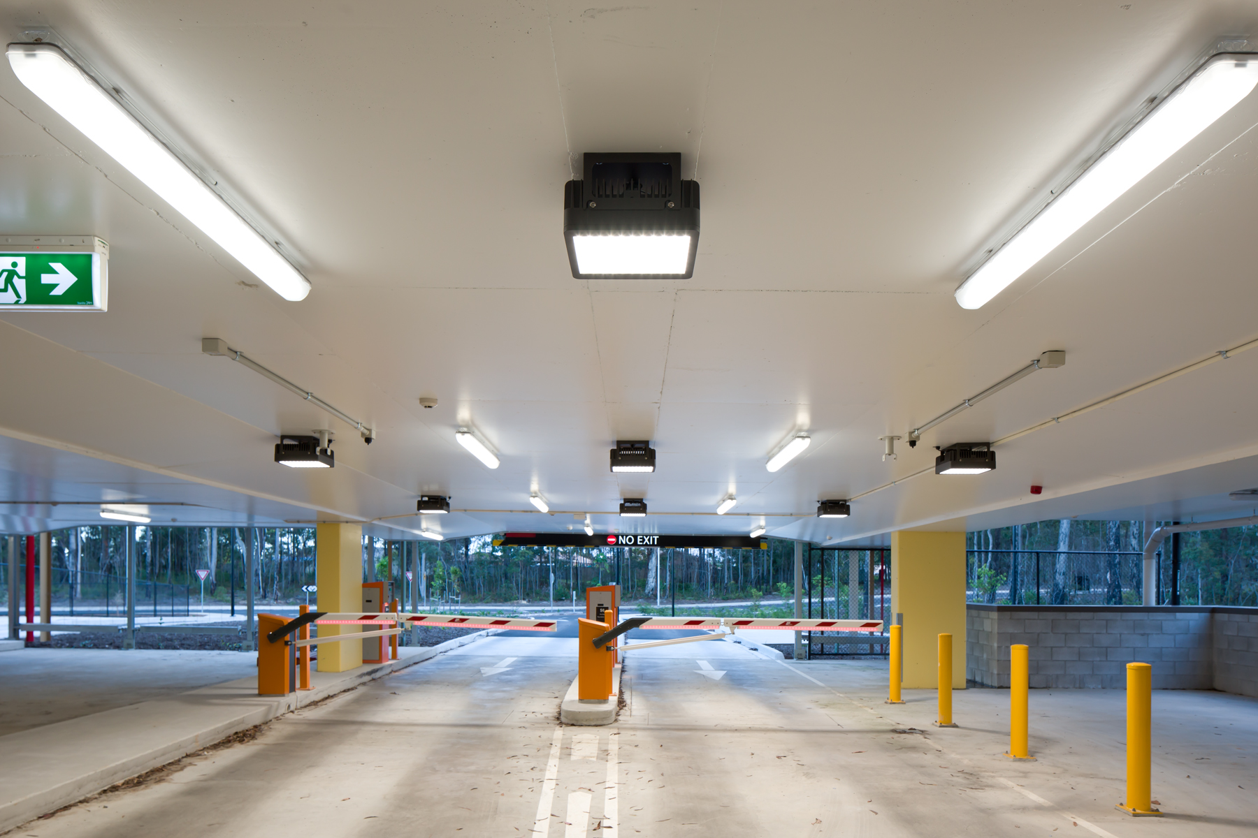 The undercover parking bays and lanes were illuminated with over 660 x Trilux Aragon T LED IP66 weatherproof luminaires with transparent housings. The transparent housing used in conjunction with the painted ceilings allowed for illumination on the ceiling creating a “non-cavernous” space, as well as providing a bright, uniform and safe environment for vehicular parking. Daylight transition lighting was provided by Trilux Mirona QXS LED surface mount lowbays.